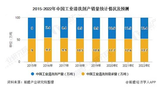 2019年,我國(guó)工業(yè)清洗劑產(chǎn)量在9.9萬噸左右,需求量為10.8萬噸,預(yù)計(jì)到2022年,我國(guó)工業(yè)清洗劑產(chǎn)量將增長(zhǎng)至12.4萬噸。2018年我國(guó)工業(yè)清洗劑市場(chǎng)規(guī)模為38.0億元,2019年我國(guó)工業(yè)清洗劑市場(chǎng)規(guī)模增長(zhǎng)至39.4億元。隨著中國(guó)制造產(chǎn)業(yè)升級(jí)的逐步實(shí)施以及中國(guó)本土企業(yè)在中高端制造業(yè)不斷取得突破,中國(guó)工業(yè)清洗劑市場(chǎng)還將取得穩(wěn)步發(fā)展。